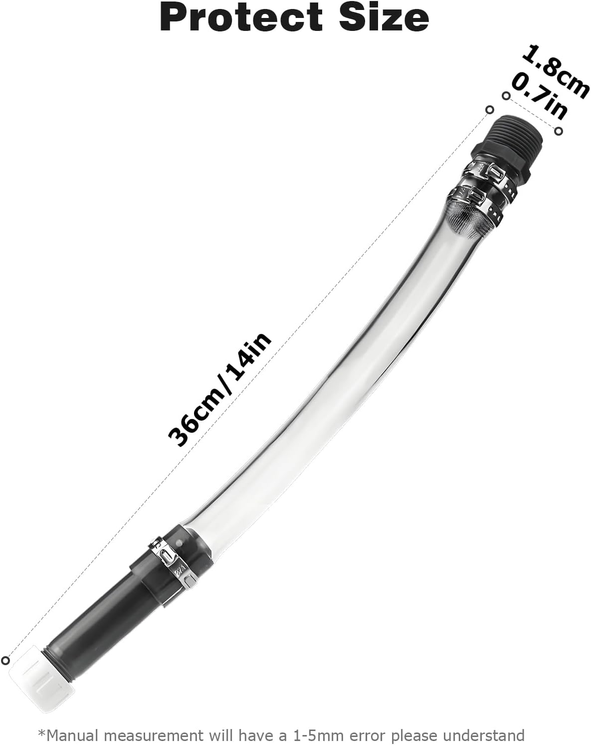 14-inch transparent fuel tank hose with a 3/4 inch thread size (standard), compatible with 5-gallon fuel jugs, LC2 tanks, tractors, and Scribner fuel tanks.