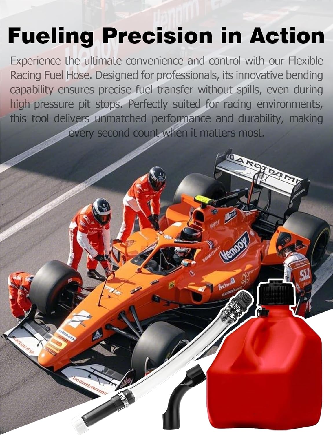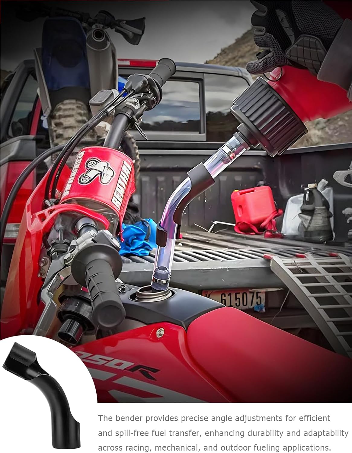 The curved with bender design of the racing fuel hose allows for easy nozzle placement in the refueling container, preventing spills. The screw-in feature ensures secure attachment during transportation, avoiding leaks or disconnections.