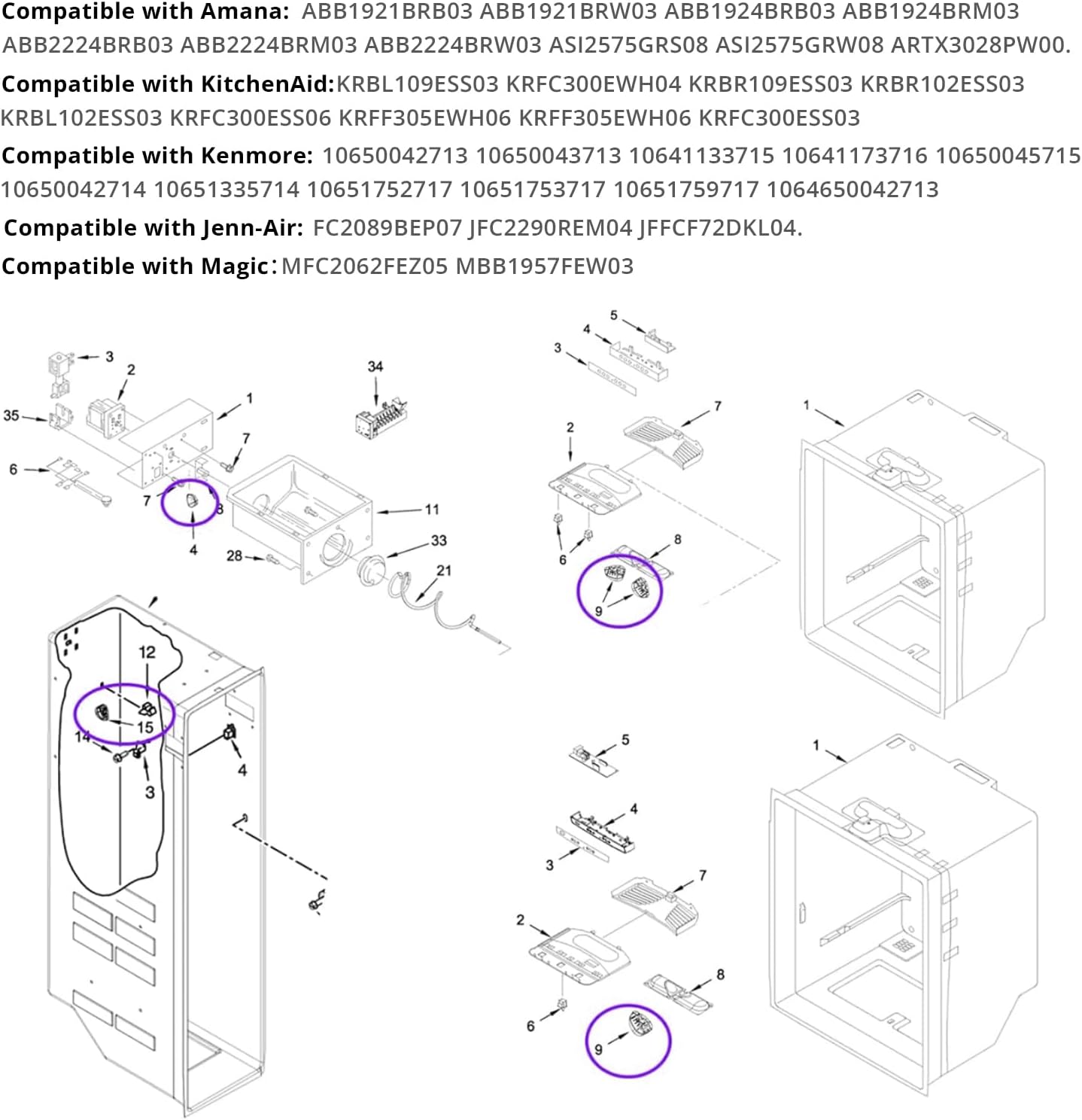 Compatible with Whirlpool WRB119WFBB01, WRX735SDHB01, WRX735SDHB02, WRX735SDHB03, WRX735SDHV01, WRX735SDHV02, WRX735SDHV03, WRX735SDHW02, WRX735SDHZ03,WRF532SMHB02, WRF532SMHV02, WRF532SMHW02, WRF532SMHZ02, WRF532SMHZ03, WRF532SMHZ04, WRF532SNHV01, WRF532SNHW01, WRF535SMHB02, WRF535SMHB03, WRF535SMHW02, WRF535SMHZ02, WRF535SMHZ04, WRF535SMHZ05, WRF535SWHB03, WRF535SWHV01, WRF535SWHV02, WRF535SWHW01, WRF535SWHW02 Compatible with Whirlpool WRF535SWHW03, WRF535SWHZ02, WRF535SWHZ03, WRF535SWHZ04, WRF535SWHZ05, WRF535SWHZ06, WRF540CWHB02, WRF540CWHV01, WRF540CWHW01, WRF540CWHW02, WRF540CWHZ02, WRF540CWHZ03, WRF540CWHZ04, WRF550CDHZ02, WRF550CDHZ03, WRF555SDFZ11, WRF555SDFZ12, WRF555SDHB01, WRF555SDHB02, WRF555SDHB03, WRF555SDHV02, WRF555SDHV04, WRF555SDHW01, WRF555SDHW02, WRF555SDHW03 Compatible with Whirlpool WRS555SIHV03, WRS555SIHW03, WRS555SIHZ03, WRFA32SMHN01, WRFA32SMHZ04, WRFA35SWHN01, WRFA35SWHN02, WRFA35SWHZ03, WRFA35SWHZ04, WRS311SDHB03, WRS311SDHB04, WRS311SDHM04, WRS311SDHT04, WRS312SNHB02, WRS312SNHM03, WRS315SDHB05, WRS315SDHM04, WRS315SDHM05, WRS315SDHZ04, WRS315SNHM03, WRS315SNHW03, WRS321SDHB04, WRS321SDHB05, WRS321SDHV05, WRB119WFBB02 Compatible with Whirlpool WRB119WFBW01, WRB119WFBW02, WRB322DMBB01, WRB322DMBW01, WRB322DMHV01, WRB322DMHV02, WRS325SDHB04, WRS325SDHW04, WRS325SDHZ04, WRB329DFBB02, WRB329DFBW01, WRB329DFBW02, WRB329DMBB01, WRB329DMBB02, WRB329DMBM01, WRB329DMBM02, WRB329DMBW01, WRB329DMBW02, WRB329LFBM01, WRB329RFBM01, WRS335SDHB03, WRS335SDHM03, WRS335SDHW00 Compatible for Amana ABB1921BRB03 ABB1921BRW03 ABB1924BRB03 ABB1924BRM03 ABB2224BRB03 ABB2224BRM03 ABB2224BRW03 ASI2575GRS08 ASI2575GRW08 ARTX3028PW00 Compatible with Jenn-Air JFC2089BEP07 JFC2290REM04 JFFCF72DKL04 Compatible with Kenmore 10650042713 10650043713 10641133715 10641173716 10650045715 10650042714 10651335714 10651752717 10651753717 10651759717 1064650042713 Compatible with KitchenAid KRBL109ESS03 KRFC300EWH04 KRBR109ESS03 KRBR102ESS03 KRBL102ESS03 KRFC300ESS06 KRFF305EWH06 KRFF305EWH06 KRFC300ESS03 Compatible with Magic MFC2062FEZ05 MBB1957FEW03
