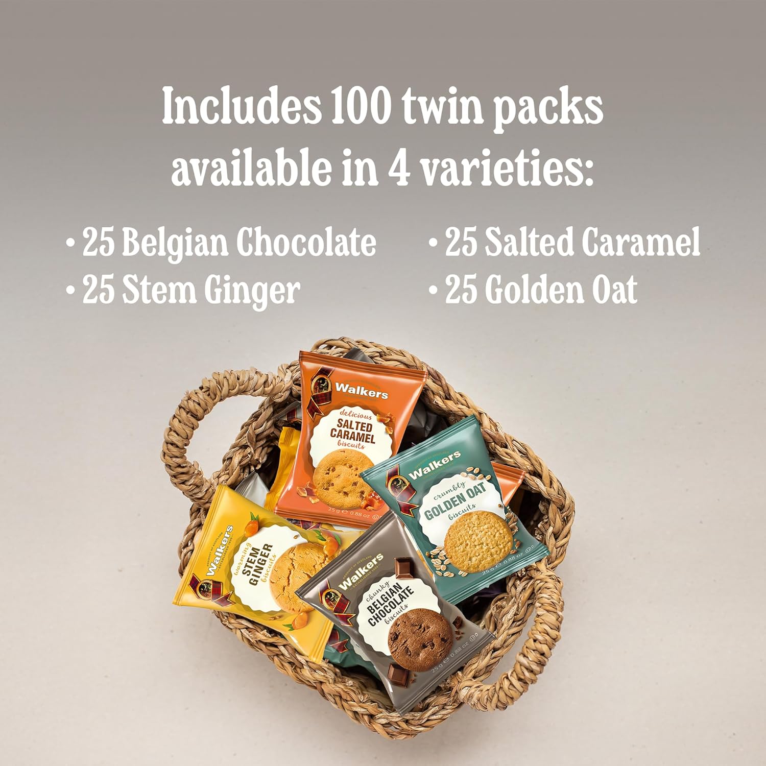 Four delicious varieties: Our cookie variety pack includes chunky Belgian Chocolate, warming Stem Ginger, delicious Salted Caramel, and crumbly Golden Oat