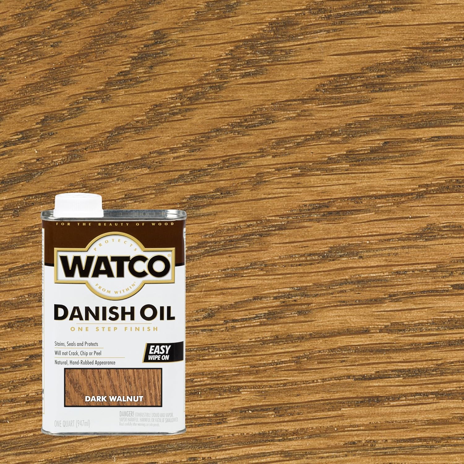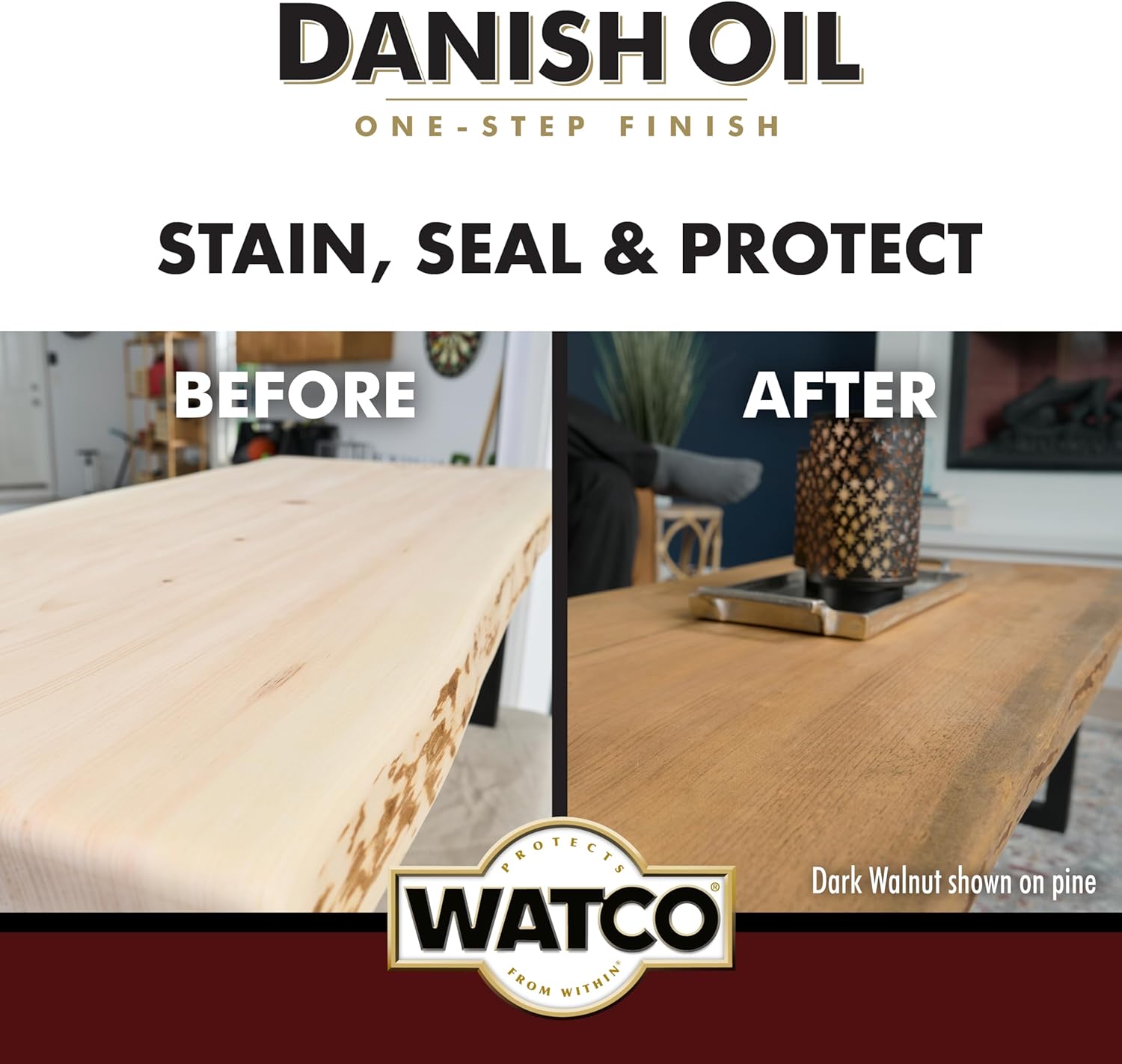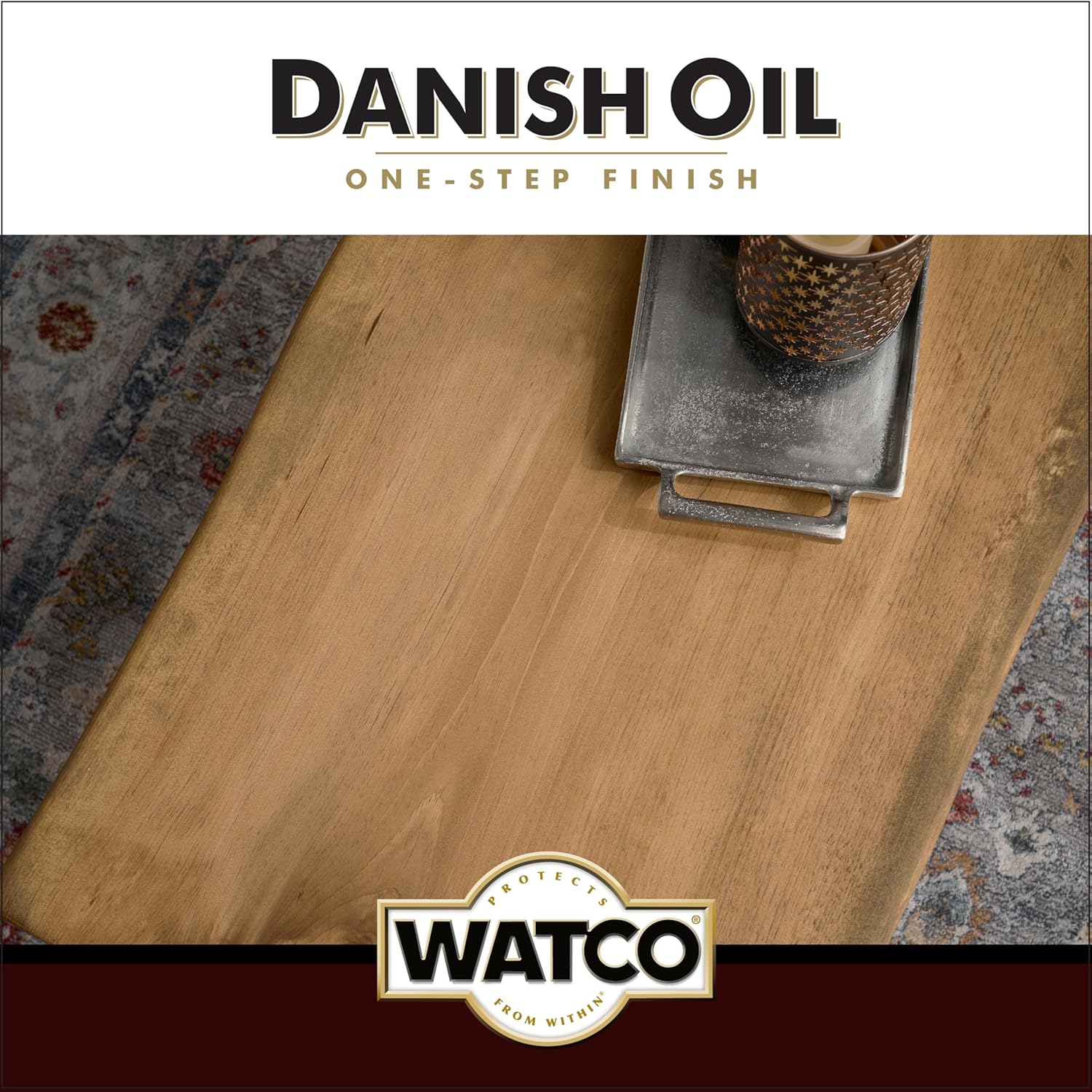 Watco Danish Oil Wood Finish stains, seals, and protects in one easy step to produce a warm, natural hand rubbed appearance. Simply brush or wipe on and wipe off to allow the penetrating oil to soak into your wood surface and protect from within. Offers superior performance on tight grained woods.