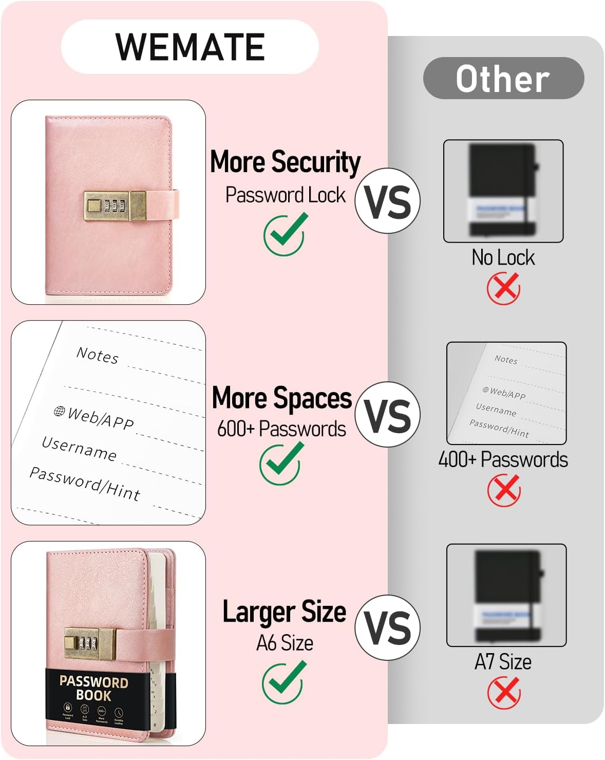 ✍ More Password Space with 600+: WEMATE password organizer with a huge space of up to 600+ website usernames & passwords to store all your account & website login details in one place, fully protecting your personal privacy, and keeping online website account information & user data safe.