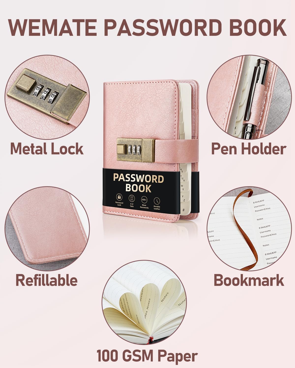 🔒 Password Book with Lock: Are you looking for the lockable password book to keep your passwords safety? WEMATE Password keeper book has a great way to organize passwords. For added security there has a creative metal lock with 0-9 three-digit combinations, and hundreds of password combinations highly confidential to help you secure internet passwords and keep your information safe and organized.