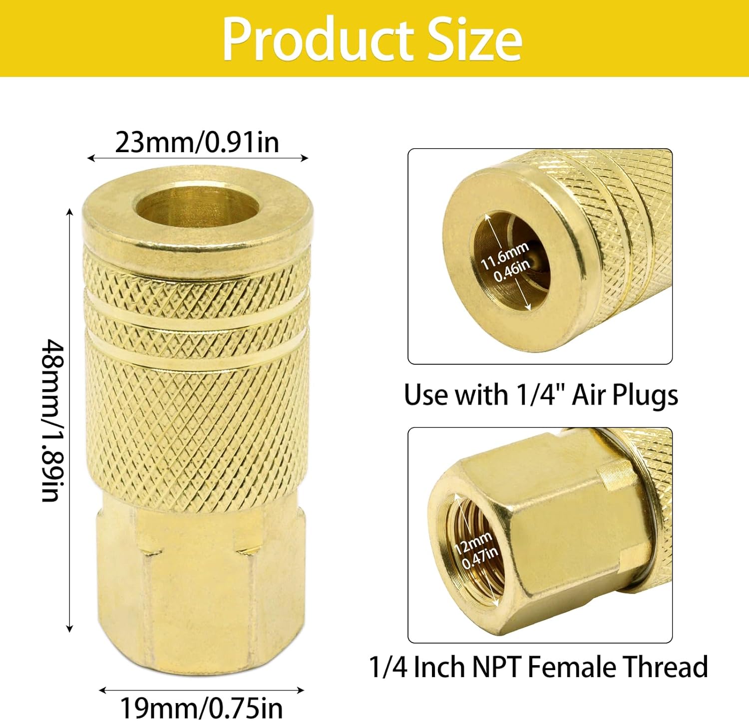 Size: Includes 2pcs 1/4 inch brass female industrial air couplers, each coupler is 1/4 inch NPT female thread × 1/4 inch body size. Maximum working pressure is 175PSI